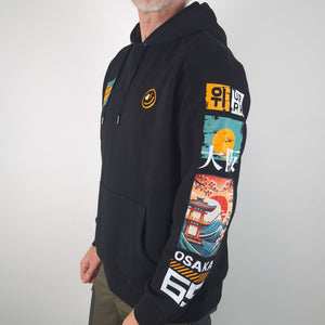 Op de rug springt de grote cirkel met verticale typografie direct in het oog, een gedurfde vertaling van het "Zero Tolerance"-principe. De mouwen zijn bedrukt met illustratieve graphics van Osaka, traditionele tempels, en moderne iconen die oosterse esthetiek combineren met streetwear edge.