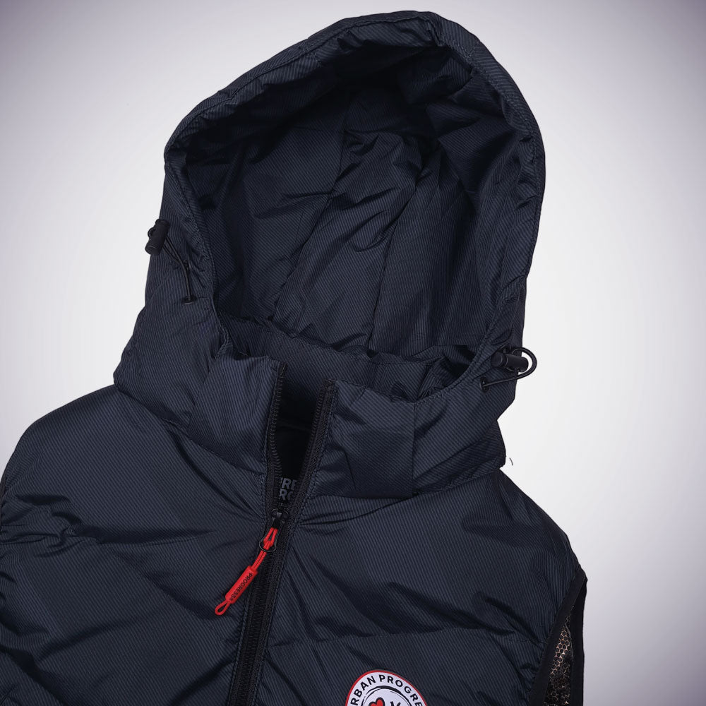 De dikke, lichtgewicht vulling van 100% polyester fiber houdt je warm zonder zwaar aan te voelen, terwijl de opstaande kraag en afritsbare capuchon extra bescherming bieden op koude dagen. De doorgestikte panelen creëren een dynamisch, atletisch silhouet en verdelen de warmte gelijkmatig.