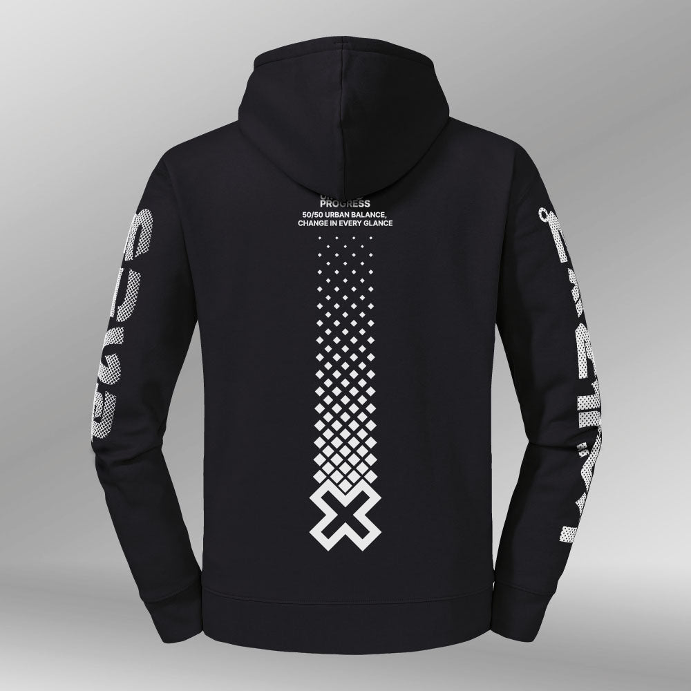 De Change the Game hoodie combineert oosterse symboliek met moderne digitale designs tot één krachtig visueel statement. De zachte binnenzijde en comfortabele regular fit maken hem ideaal voor elke dag. Op de borst straalt het cirkellogo met subtiele Japanse karakters focus en energie uit, terwijl de grafische prints op mouwen en rug een futuristische balans creëren tussen ritme, contrast en verandering. De opvallende X op de rug symboliseert kruispunten, keuzes, groei en actie. Alles aan dit ontwerp ademt beweging.