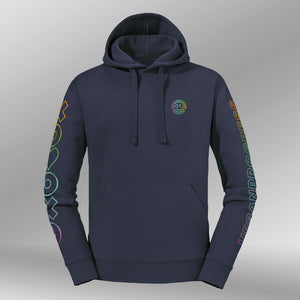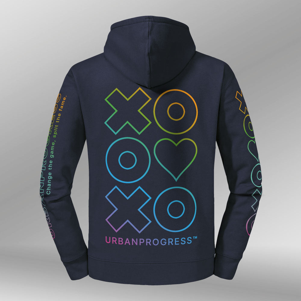 De Royal Hoodie Love Emotion straalt een krachtige boodschap van verbinding en expressie uit. Het zwarte canvas vormt de perfecte basis voor een kleurrijk lijnenspel van X's, O's en een hart, subtiel opgebouwd in een regenboogverloop. Op de borst prijkt een inspirerende Japanse tekst: “Liefde is geen beslissing, maar een gevoel,” die deze hoodie tot een echte conversation starter maakt. De boodschap loopt door in de details: op de mouw staat “Change the game, split the fame”, een knipoog naar durven afwijken van de norm. De achterkant weerspiegelt dezelfde speelse kracht, met een symmetrisch grid van kleurrijke symbolen die liefde en inclusiviteit uitstralen. De Love Emotion is niet zomaar een hoodie het is een wearable statement dat zelfexpressie, openheid en liefde viert.