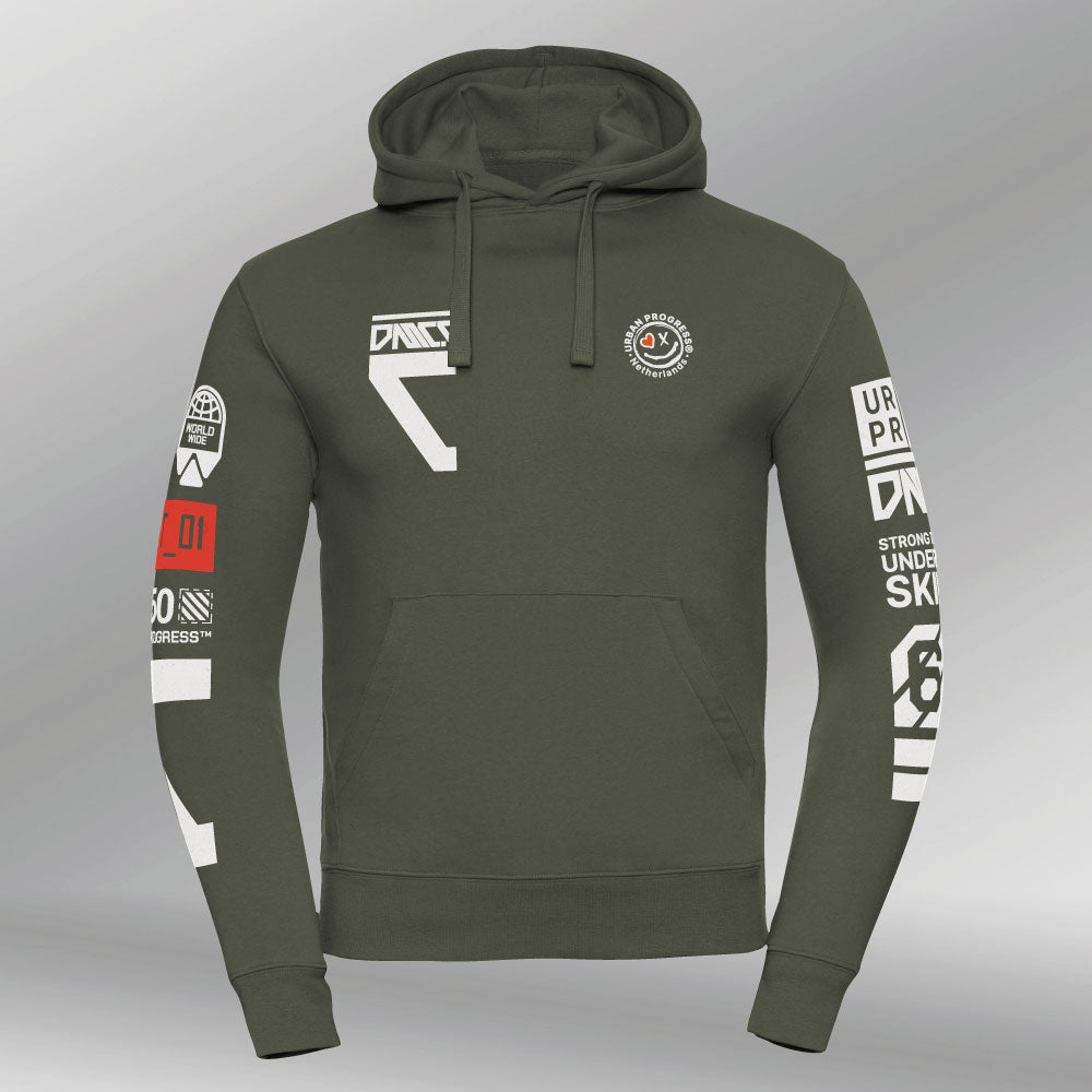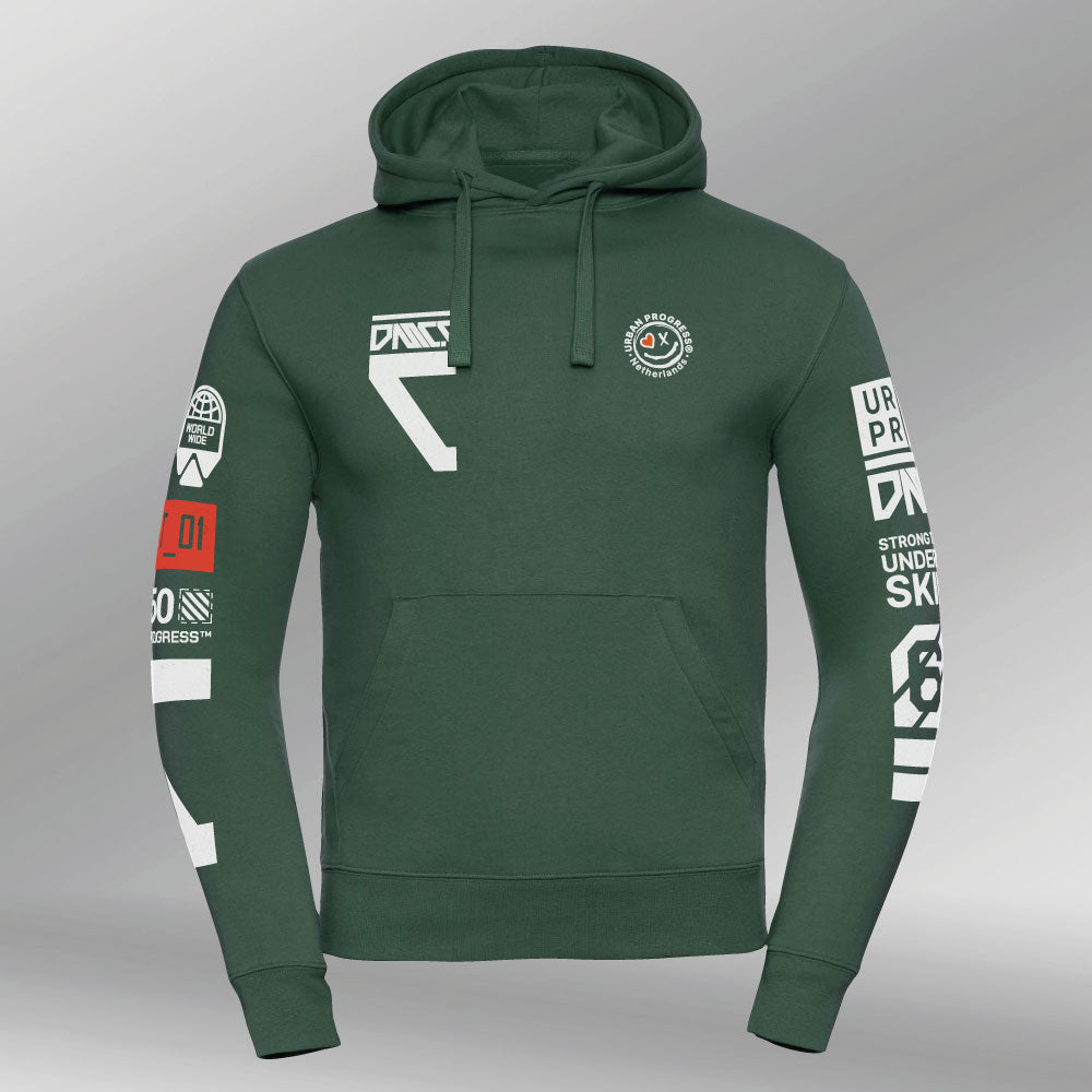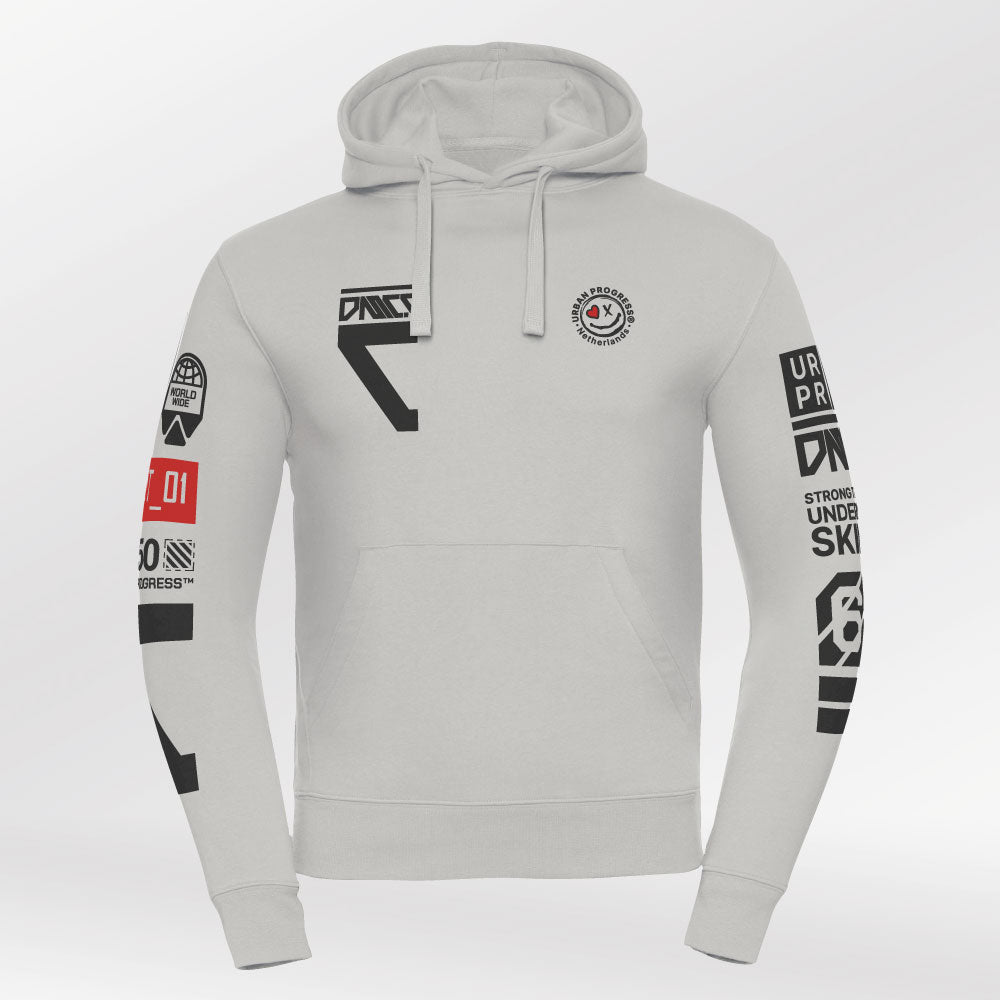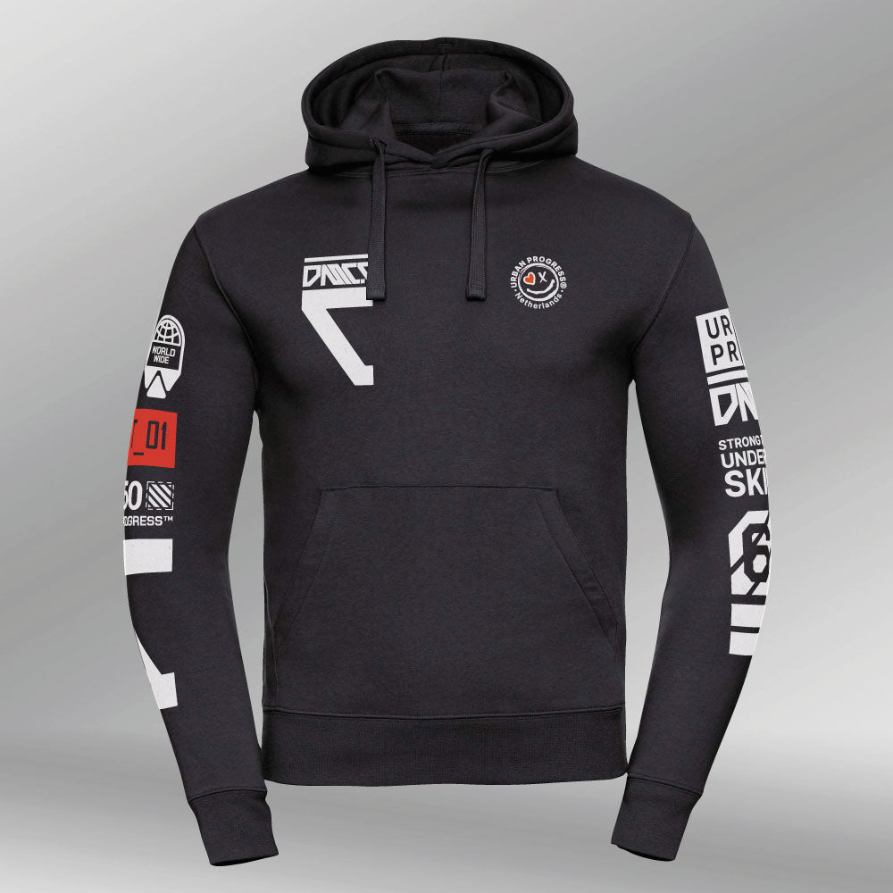 Op de voorkant vind je een krachtige mix van iconische Urban Progress-prints: strakke lijnen, patches met wereldwijde referenties, en een subtiel contrasterende smiley-badge voor een speelse twist. De armen zijn volledig uitgewerkt met layered graphics, waardoor de hoodie vanuit elke hoek karakter heeft.