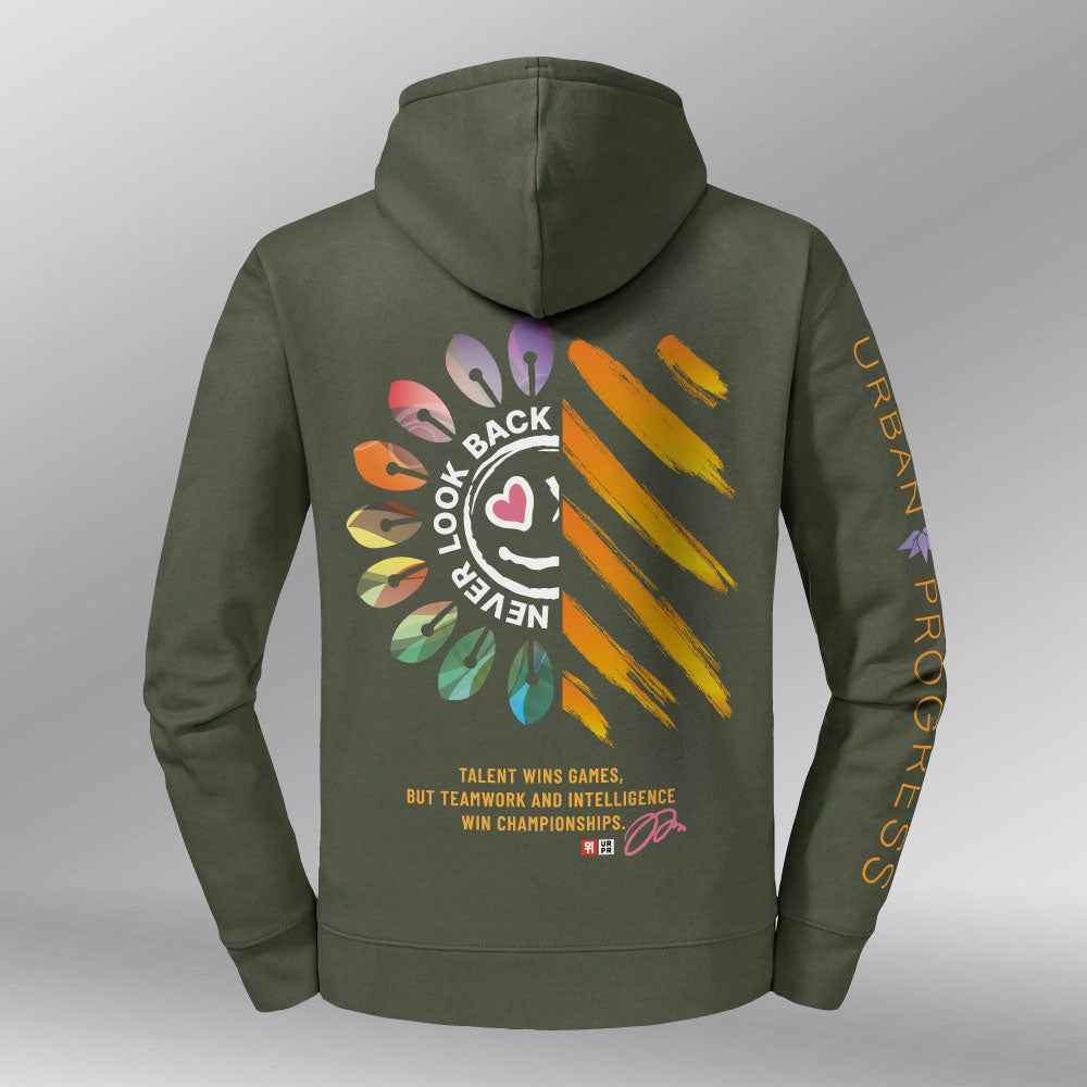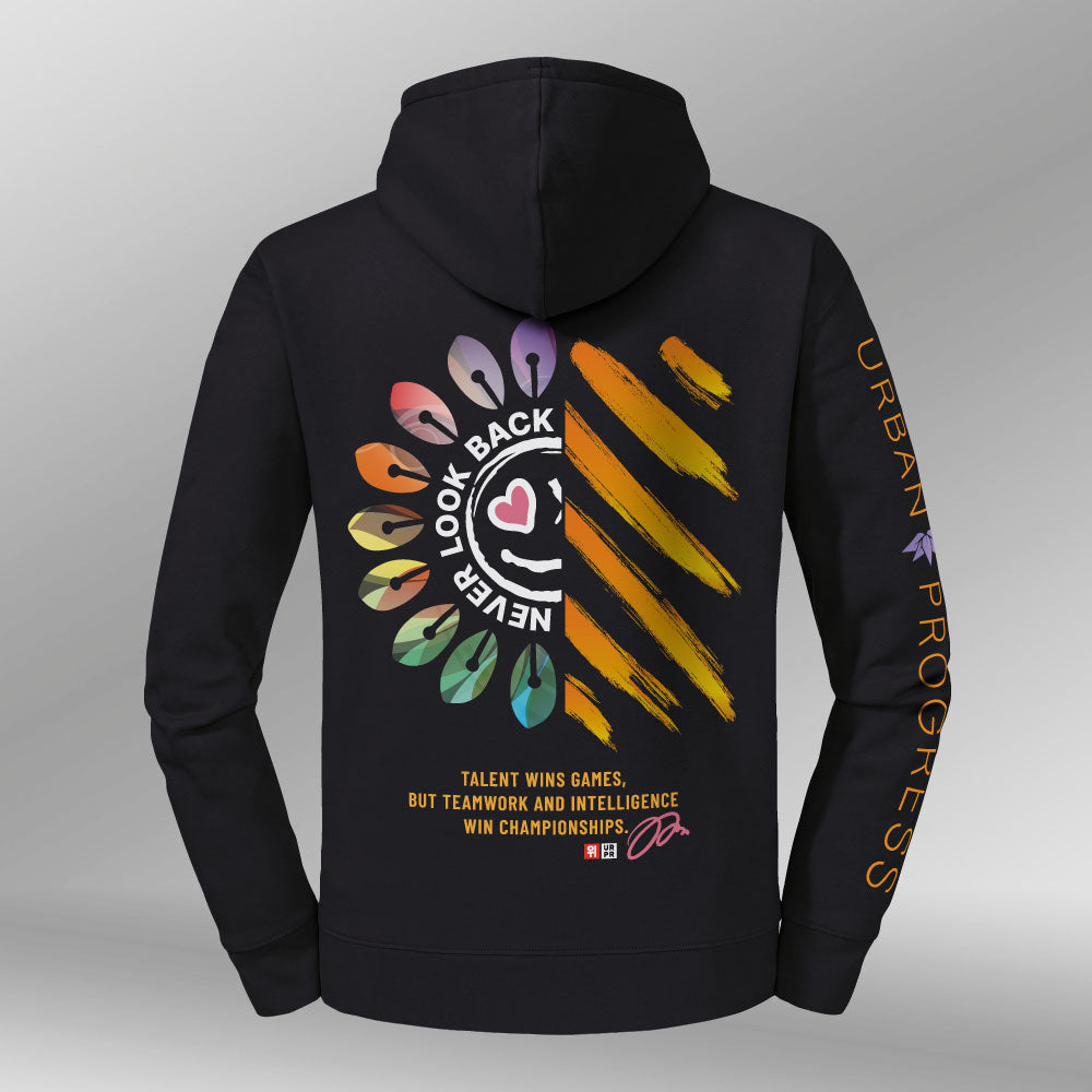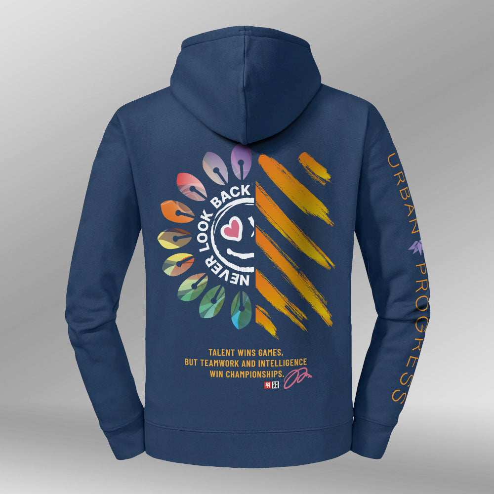 De Victory Vibes hoodie is een kleurrijk eerbetoon aan teamwork, energie en vooruitgang. De achterkant springt direct in het oog met een unieke combinatie van brush strokes, kleurrijke vlamvormen en een centrale smiley, een explosie van positiviteit. De quote “Talent wins games, but teamwork and intelligence win championships” onderstreept waar Urban Progress voor staat: samen sterker.