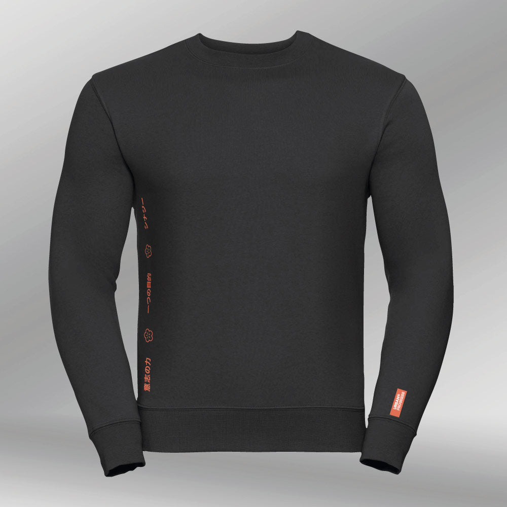 De voorkant is clean en krachtig: subtiele Japanse symbolen aan de zijkant vertegenwoordigen één doel, wilskracht en synergie, de kern van vooruitgang. De verfijnde opdruk in oranje- en goudtinten geven de trui een sterke, premium uitstraling met oosterse invloeden.