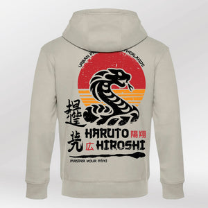 Een hoodie met de kracht van symbool en verhaal. De Royal Hoodie Haruto Hiroshi combineert een opvallende retro-zonsondergang met een krachtige slangillustratie en traditionele Japanse karakters, die staan voor meesterschap, licht en groei. Centraal prijkt het duo Haruto & Hiroshi, namen die kracht, richting en betekenis geven aan de mindset "Master Your Mind".