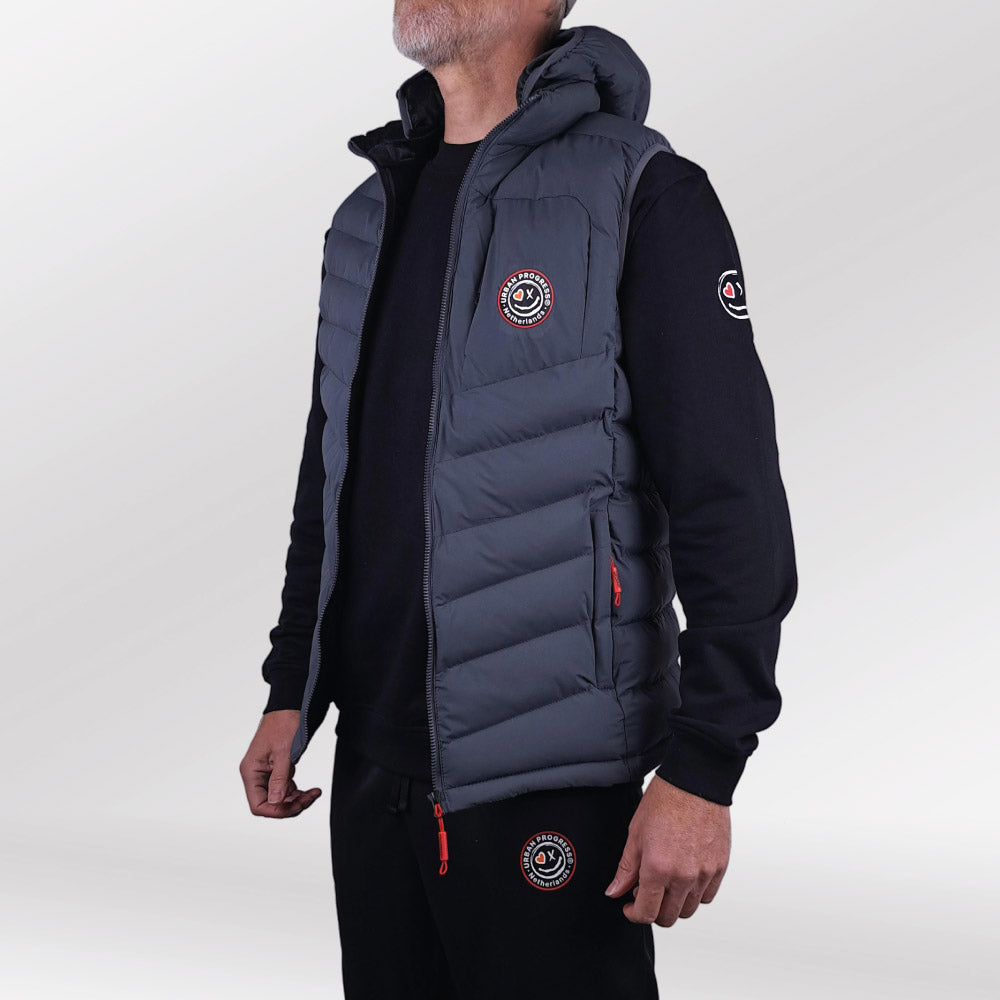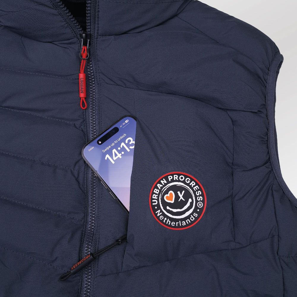 De subtiele Urban Progress® branding en contrasterende ritsdetails geven de bodywarmer een verfijnde, sportieve uitstraling, perfect te combineren met een hoodie, sweater of longsleeve.